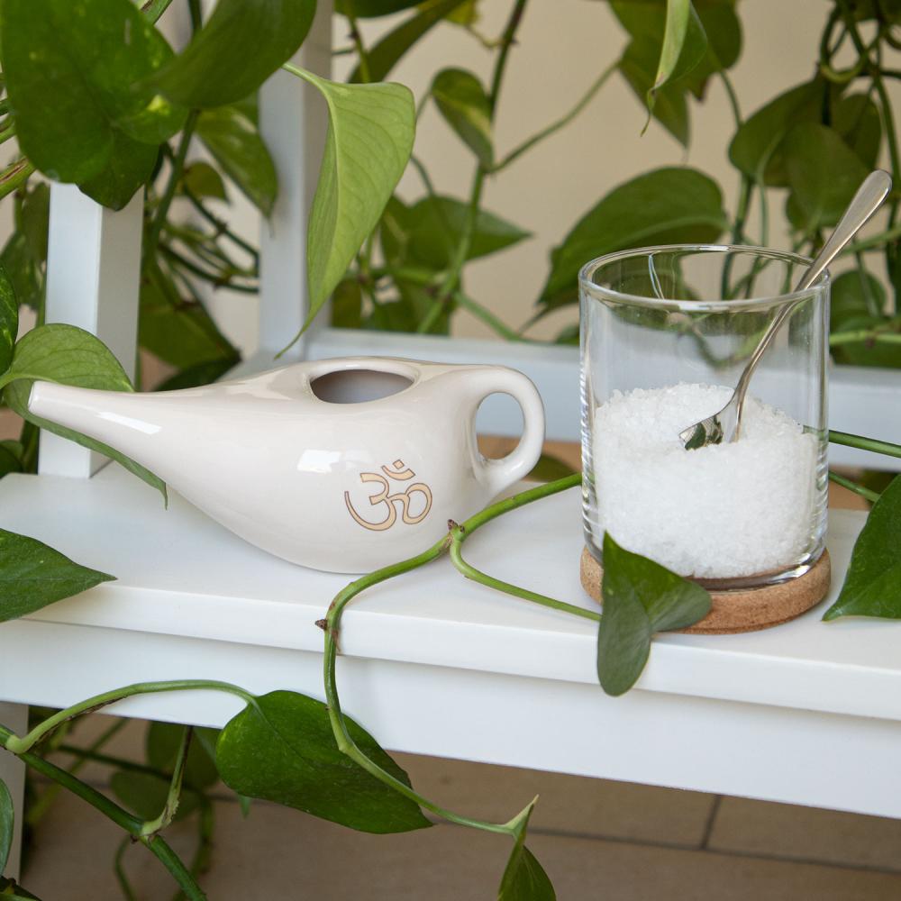 Mit diesem schöne Neti Pot Nasenspülkännchen aus Keramik kannst du wirkungsvoll deinen Nasen- und Rachenraum reinigen und pflegen. Die Nasenspülung mit warmem Salzwasser wird auch als Jala Neti bezeichnet und gehört zu den sechs yogischen Reinigungsübungen, den sogenannten Shat Kriyas. Die Neti Pots werden aus aufwändig glasierter Keramik gefertigt und sind mit einem OM Symbol versehen. Die Nasendusche hat einen positiven Effekt auf den gesamten Nasen- und Rachenraum: Staub, Pollen und Verkrustungen werden gelöst und weggespült und die Nasenschleimhaut wird in ihrer Abwehrfunktion unterstützt. Die regelmäßige Nutzung des Nasenspülkännchens kann Atemwegserkrankungen auf natürliche und sanfte Weise vorbeugen und Linderung verschaffen bei verstopfter Nase, Erkältungen oder Entzündungen der Stirn- und Nebenhöhlen.Traditionelles Nasenspülkännchen zur Reinigung des Nasen- und Rachenbereichs